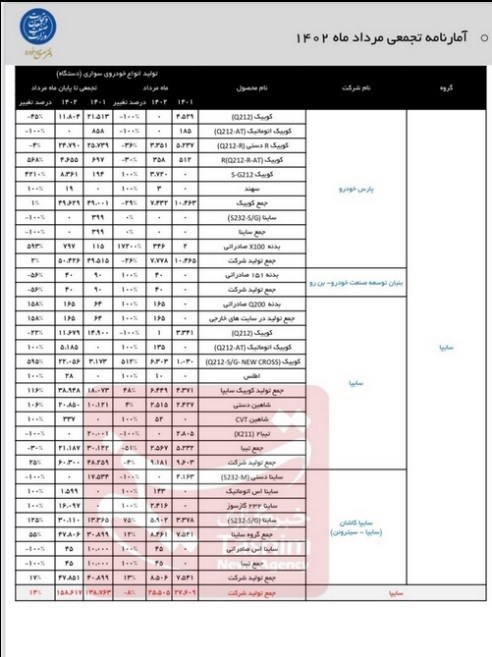 در پارس خودرو نیز تولید کوئیک اتوماتیک و ساینا متوقف و در سایپا نیز تولید تیبا دو و ساینا دستی متوقف شده است. در مجموع گروه ایران خودرو و سایپا تا پایان مردادماه امسال شاهد رشد 14 درصدی تولید بوده است.