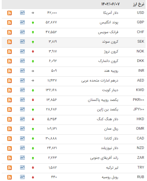 بانک مرکزی امروز نرخ هر دلار را ۴۲ هزار ریال، پوند را ۵۲ هزار و ۸۷۷ ریال و یورو را ۴۵ هزار و ۳۹۷ ریال اعلام کرد.