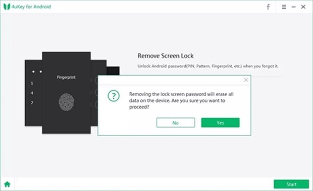 در صفحه اصلی نرم افزار، گزینه Remove Screen Lock را انتخاب کنید. برای این کار، کلید Start را فشار دهید تا فرآیند حذف پسورد آغاز شود. سپس با فشردن کلید OK، فرآیند را تایید نمایید.