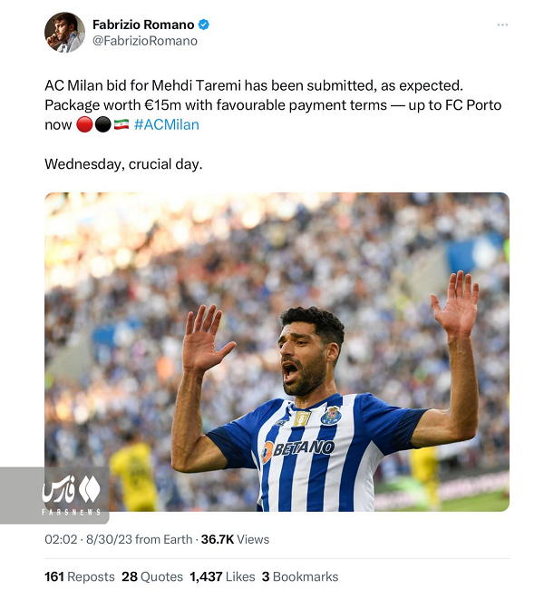 در همین رابطه فابریزیو رومانو خبرنگار. مطرح و معتبر نقل و انتقالات امروز خبر داد همچنان که انتظار می رفت پیشنهاد رسمی میلان به ارزش 15 میلیون یورو با شرایط پرداخت خوب برای جذب مهدی طارمی به دست پورتو رسید. امروز چهارشنبه روز سرنوشت طارمی است.
