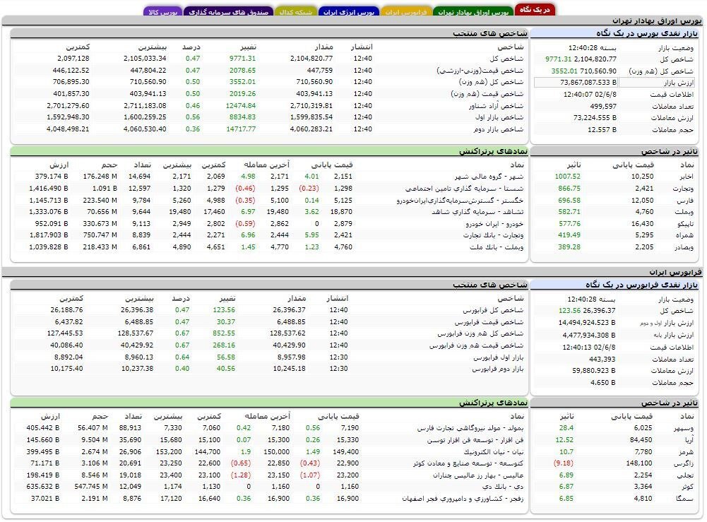 در فرابورس روند رو به رشدی وجود داشت. شاخص کل در این بازار با افزایش ۱۲۳ واحدی نسبت به دیروز روی ۲۶ هزار و ۳۹۶ واحد ایستاد. در این بازار نیز بیش از ۴۴۲ هزار معامله انجام شد که ارزشی بالغ بر ۵۹ هزار و ۱۷۹ میلیارد ریال داشت.