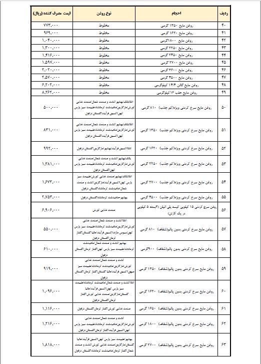 بنا براین گزارش، بر اساس مصوبه کارگروه تنظیم بازار در تاریخ ۶ شهریور ۱۴۰۲ سازمان حمایت مصرف کنندگان و تولیدکنندگان قیمت های مصرف کننده جدید انواع روغن نباتی را در سایت www.۱۲۴.ir بارگذاری کرد.