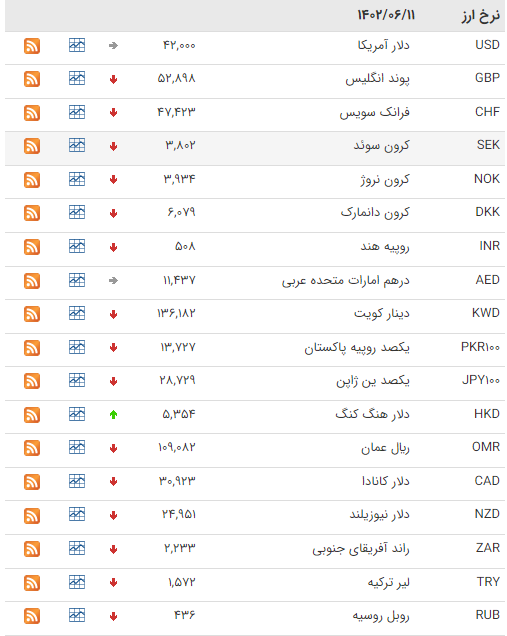 بانک مرکزی امروز، شنبه 11شهریور ۱۴۰۲، نرخ رسمی ۴۶ ارز را اعلام کرد که بر اساس آن نرخ 14 ارز افزایش و نرخ 26 ارز کاهش یافت، نرخ باقی ارزها ثابت ماند.
