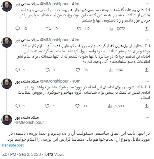 اقای منشی‌پور از این اتفاق ابراز تأسف کرده و مسئولیت آن را پذیرفته است و در خاتمه صحبت‌های خود وعده داده تا بررسی دقیقی در مورد دلایل وقوع این سرقت اطلاعاتی انجام خواهد داد و متعاقبا گزارش این بررسی را اعلام خواهد کرد. برخی اطلاعات تأیید نشده از سمت هکرهای حکایت از آن دارد که اطلاعات بیش از ۲۷ میلیون مسافر و ۶ میلیون راننده شامل نام، نام خانوادگی، کد ملی و شماره همراه و همچنین اطلاعات ۱۳۶ میلیون سفر در کنار سورس کد برخی محصولات این شرکت در این حمله سایبری به سرقت رفته است.