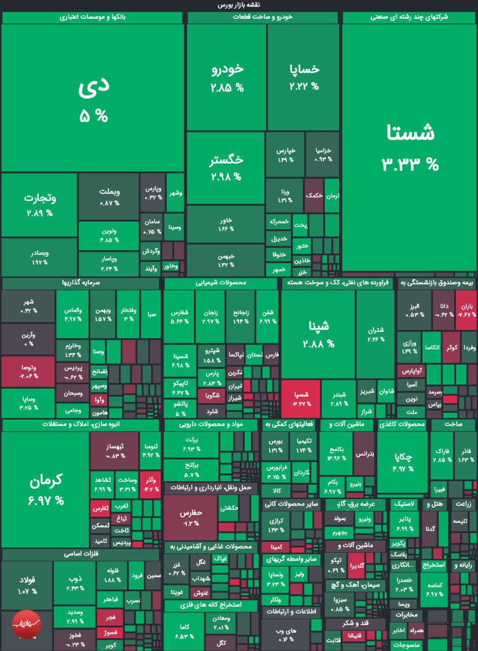 نماد‌های تکاردان، شستا، شپنا، ثامان، خگستر، خودرو و شتران هم از نماد‌های پرتراکنش با تاثیر مثبت بر بازار سهام بودند.