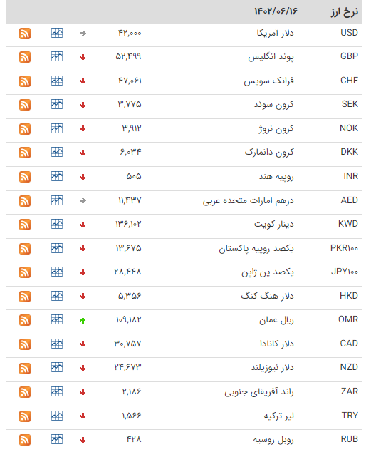 بانک مرکزی امروز، پنجشنبه ۱۶ شهریور ۱۴۰۲، نرخ رسمی ۴۶ ارز را اعلام کرد که بر اساس آن نرخ ۶ ارز افزایش و نرخ ۳۴ ارز کاهش یافت، نرخ باقی ارزها ثابت ماند.
