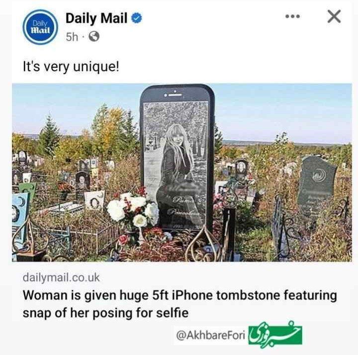 یک دختر فعال شبکههای اجتماعی فوت کرده، سنگ قبرش او را به شکل گوشی ساخته و عکس پروفایلش را روی آن حکاکی کرده اند!