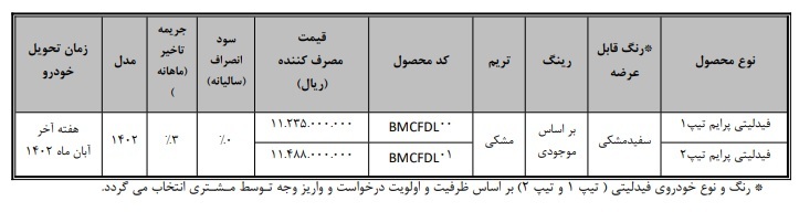 طرح فروش فوری خودروی فیدلیتی از روز سه شنبه 21 شهریورماه ساعت 10 صبح لغایت 28 شهریورماه 1402 در سایت فروش بهمن موتور فعال خواهد بود.