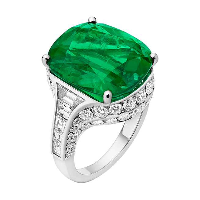 برند بولگاری یکی دیگر از برندهای بزرگ و معروف در عرصه ساخت جواهرات است که حرف اول را در کشور ایتالیا میزند. این برند معتبر توانسته است در طول سالهای فعالیت خود مجموعههای بینظیری را طراحی کند که از سنگهای گرانقیمت ساخته شدهاند. یکی از اثار شاهکار برند بولگاری، انگشتری است که از الماس بسیار با کیفیت و خوش تراش ساخته شده است. این انگشتر از جنس پلاتین یا طلای سفید تولید شده و یک سنگ زمرد بسیار بزرگ با وزن ۴.۲۵ قیراط دارد. این سنگ زمرد بسیار زیبا و چشم نواز است و با دقت بالایی تراش داده شده تا شکل و درخشندگی بهتری داشته باشد.