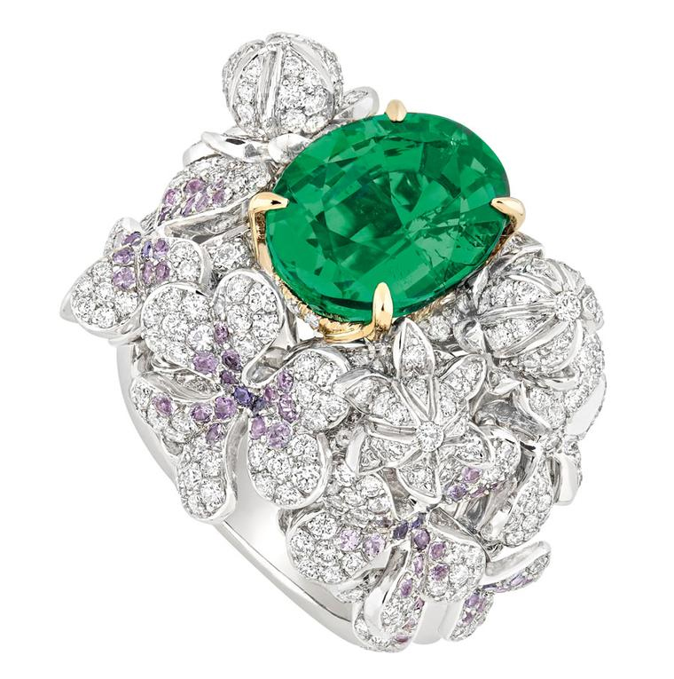 برند دیور نیز از جمله تولیدکنندگان معتبر جواهرات و زیورآلات با ارزش در جهان است. این برند با طراحی انگشترهای زیبا و شگفتانگیز با سنگهای قیمتی و رنگارنگ، خلاقیت و استعداد خود را به نمایش گذاشته است. یکی از جواهرات برجسته این برند، انگشتر Volant Emeraude در مجموعه Soie Dior است. این انگشتر دارای یک سنگ زمرد سبزرنگ بسیار زیبا است که با الماسهای سفید و کوچک در اطراف آن تزیین شده است. طراحی گلی در مرکز این انگشتر به آن زیبایی خاصی میبخشد و از جنس طلای سفید ساخته شده است. این انگشتر با ترکیب زمرد و الماسهای سفید، جواهری خیرهکننده و لوکس را ایجاد کرده که برای دوستداران جواهرات زیبا بسیار جذاب است.