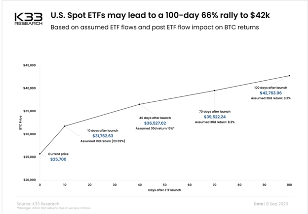 بر اساس تحقیقات K۳۳، چراغ سبز برای ETF نقطهای بیت کوین می تواند رشد صعودی ۶۶ درصدی را رقم بزند.