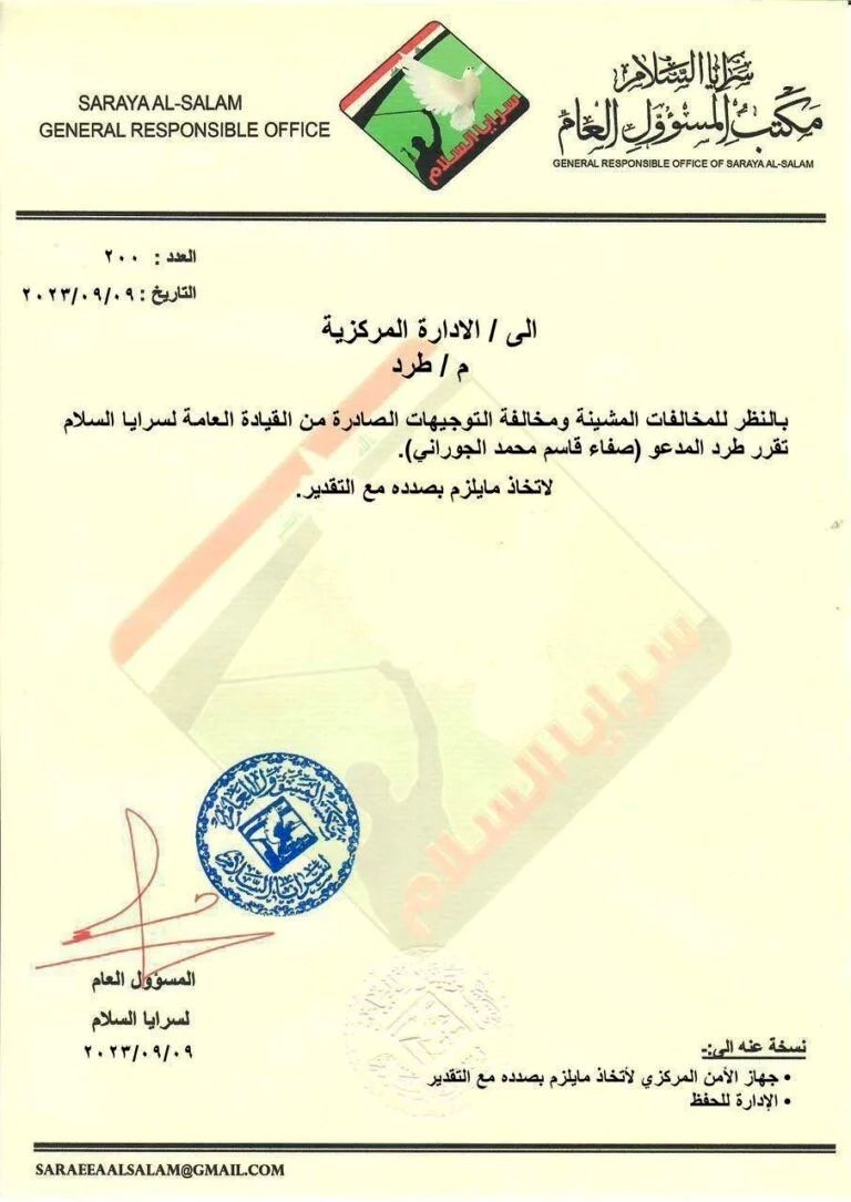 شبکه الرابعه نوشت، براساس سندی که از سوی مسئول کل سرایا السلام منتشر شده، آمده است که با توجه به تخلفات شرم آور و مخالفت با دستورات صادره از سوی فرماندهی کل سرایا السلام، صفا قاسم محمد الجورانی، از سرایا السلام اخراج شد.