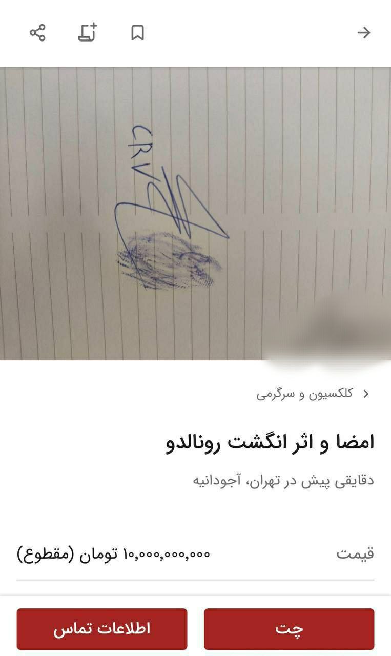امضا و اثر انگشت رونالدو، ۱۰ میلیارد تومان مقطوع در یک سایت به فروش می رسد.