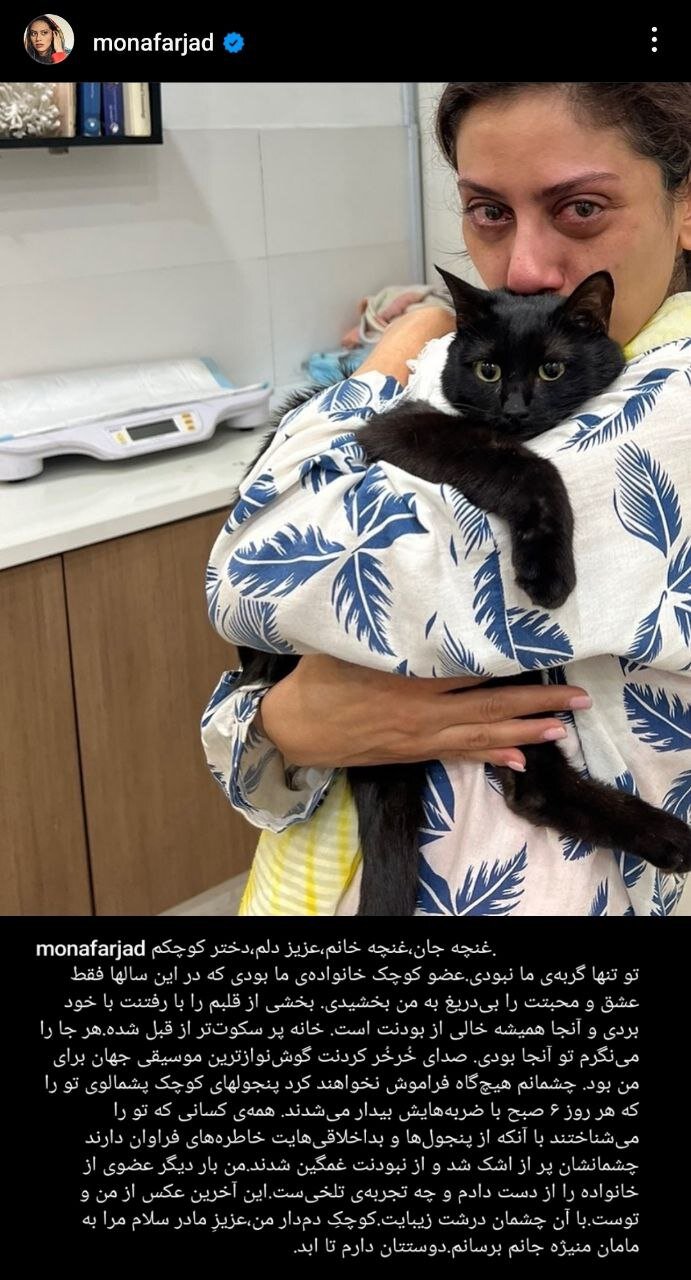 پست اینستاگرامی عجیب مونا فرجاد برای مرگ گربه‌اش واکنش‌های بسیاری در شبکه های اجتماعی به همراه داشته است.