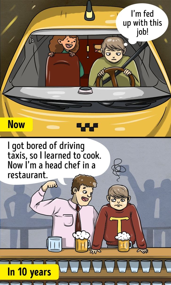ما اغلب به دلیل دودلی و بی میلی مان به خارج از شدن حاشیه ی امن خود، کار در شغلی که از آن بیزاریم را ادامه می دهیم. اما اگر ریسک نکنیم و چیزی را در زندگی مان تغییر ندهیم، ممکن است در شغلی که علاقه ای به آن نداریم محو شویم.