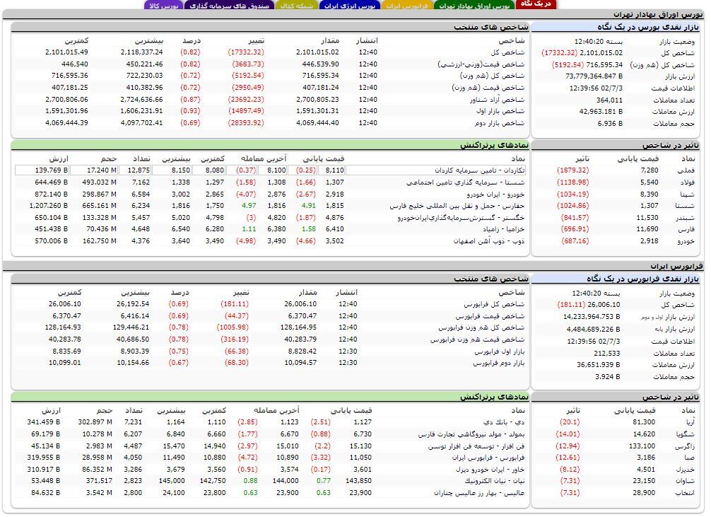 پلیمر آریا ساسول، پتروشیمی تندگویان، پتروشیمی زاگرس، سرمایه‌گذاری صبا تامین، ایران خودرو دیزل، بهمن دیزل، گروه انتخاب الکترونیک آرمان و پالایش نفت لاوان بیشترین تاثیر را روی شاخص فرابورس گذاشتند و در این میان همه نمادهای مذکور روند منفی داشتند.