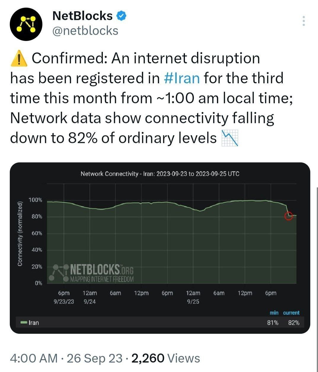 نت بلاکس اعلام کرد بامداد امروز اینترنت ایران برای بار سوم در یک ماه اخیر دچار اختلال شد و به سطح ۸۲ درصد کاهش پیدا کرد.