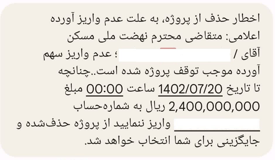 «اخطار حذف از پروژه،بهعلت عدو واریز آورده اعلامی: متقاضی محترم نهضت ملی مسکن آقا/خانم... ؛ عدم واریز سهم آورده موجب توقف پروژه شده است.