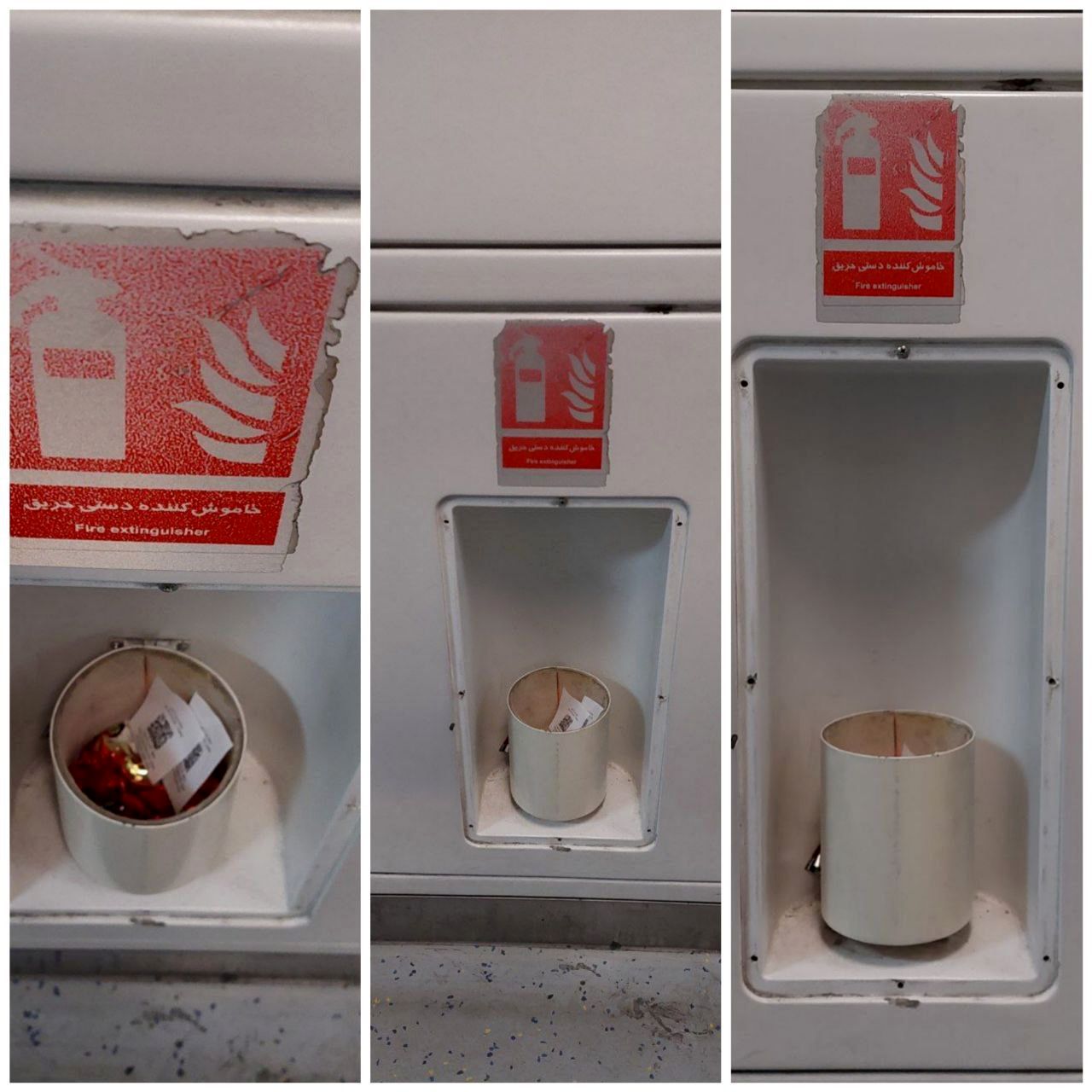 کپسولهای آتشنشانی قطار به سرقت رفته است و محفظه کپسول تبدیل به سطل آشغال مسافران شده است!