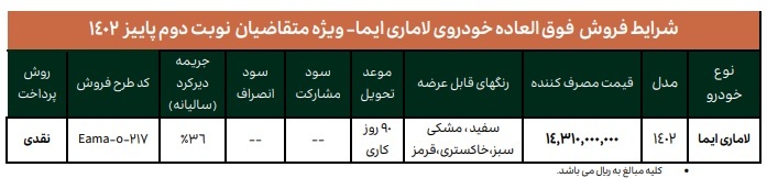 بدین منظوراز متقاضیان دعوت بعمل می آید جهت تکمیل فرایند ثبت نام و عقد قرارداد فروش فوق العاده به قیمت قطعی وبا موعد تحویل ٩٠ روز کاری از ساعت ١٠ صبح روزیکشنبه مورخ ١٤٠٢/٠٧/٠٩ لغایت پایان روز یک شنبه مورخ ١٤٠٢/٠٧/١٦ به صورت اینترنتی نسبت به انجام مراحل ثبت نام خودروی لاماری ایما اقدام نمایند.