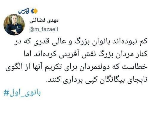 مهدی فضائلی عضو دفتر نشر آثار رهبر انقلاب در توئیتی نوشت: کم نبوده اند بانوان بزرگ و عالی قدری که در کنار مردان بزرگ نقش آفرینی کرده اند اما خطاست که دولتمردان برای تکریم آنها از الگوی نابجای بیگانگان کپی برداری کنند.