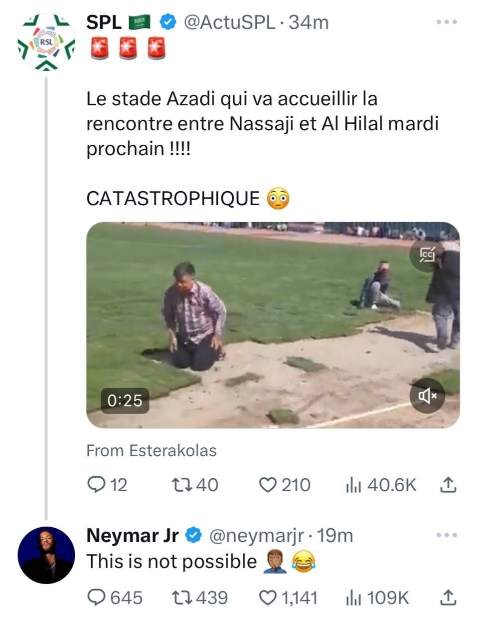 در این بین نیمار، ستاره برزیلی الهلال پس از مشاهده این ویدیو با انتشار یک کامنت تعجب خود از این روند را نشان داد. او در توئیتر خود نوشت: «این غیرممکن است!»