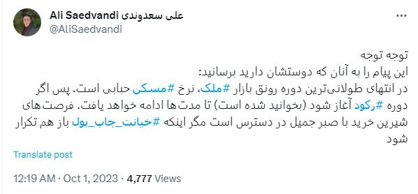 سعدوندی در یک پیام توئیتری که در ابتدای آن تاکید کرده «این پیام را به آنان که دوستشان دارید برسانید»، نوشته است: «در انتهای طولانیترین دوره رونق بازار ملک، نرخ مسکن حبابی است؛ پس اگر دوره رکود آغاز شود (بخوانید شده است) تا مدتها ادامه خواهد یافت. فرصتهای شیرین خرید با صبر جمیل، در دسترس است مگر اینکه خیانت چاپ پول باز هم تکرار شود.»