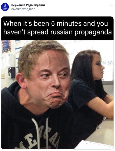 پارلمان اوکراین هم در صفحه خودش در ایکس، ماسک را به «ترویج پروپاگاندا روسی» متهم کرد و به سبک خودش با انتشار عکسی از ماسک نوشت: «وقتی ۵ دقیقه گذشته و پروپاگاندا روسی را ترویج ندادهای.»
