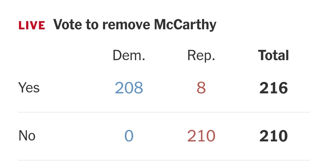 بعد از برگزاری رأیگیری، با رأی قانونگذاران مجلس نمایندگان آمریکا مککارتی رئیس جمهوریخواه این مجلس از سمت خود برکنار شد؛ این اولین بار در تاریخ این کشور است که یک رئیس مجلس نمایندگان از این سمت برکنار میشود.