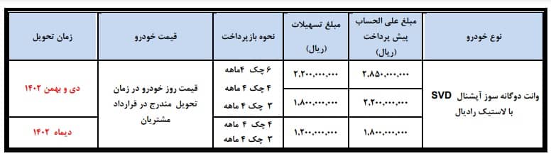 زامیاد در این طرح، وانت نیسان دوگانه سوز آپشنال SVD مجهز به لاستیک رادیال را با سه نوع پیش‌پرداخت شامل 285 میلیون تومان، 220 میلیون تومان و 180 میلیون تومان به مشتریان عرضه می‌کند. قیمت روز خودرو نیز همان قیمت روز خودرو در زمان تحویل مندرج در قرارداد مشتریان خواهد بود. زمان تحویل این خودرو نیز بسته به مبلغ پیش‌پرداخت در دی و بهمن 1402 اعلام شده است.پ