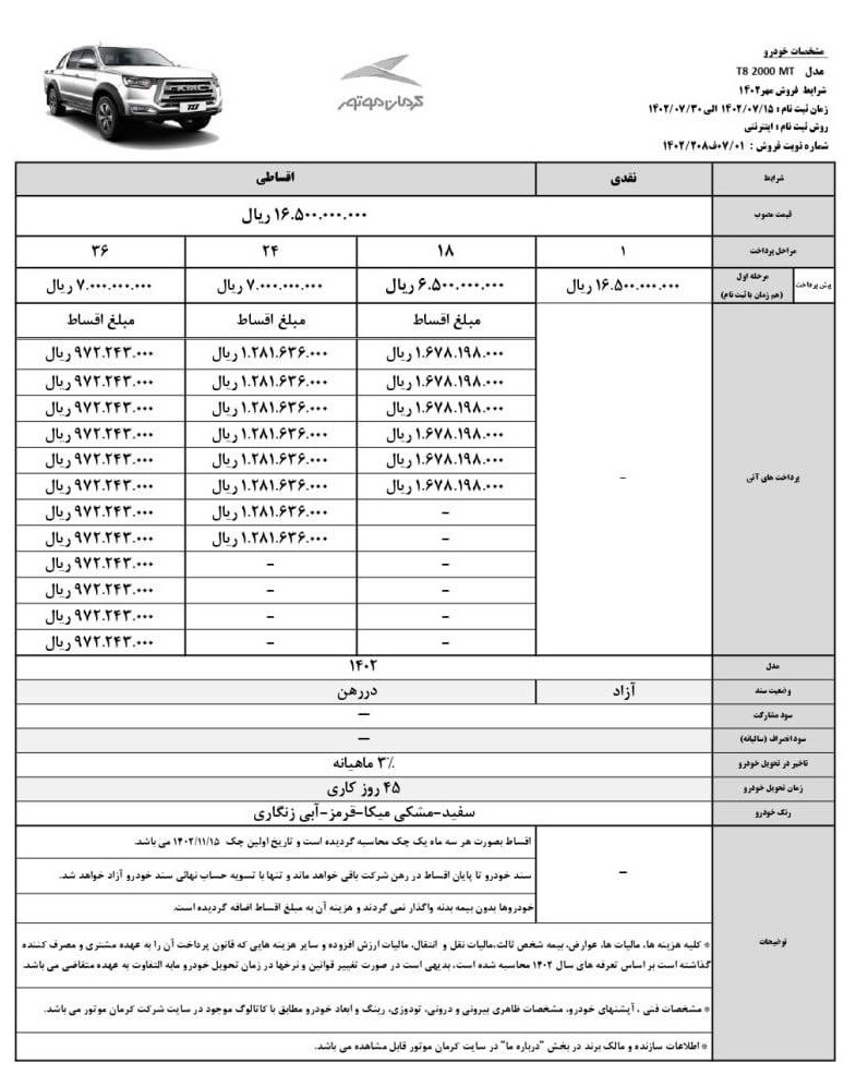 فروش پیکاپ KMC T8 شرکت کرمان موتور ویژه مهرماه 1402 با اقساط 36 ماهه از شنبه هفته آینده مطابق جدول ذیل فعال خواهد شد.