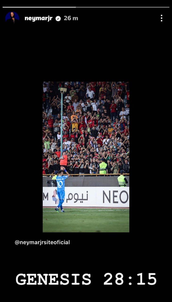 خود نیمار نیز این پست که تصویری از لحظه نشان دادن ابراز احساستش نسبت به تشویق هواداران حاضر در استادیوم آزادی است را در صفحهاش استوری کرد.