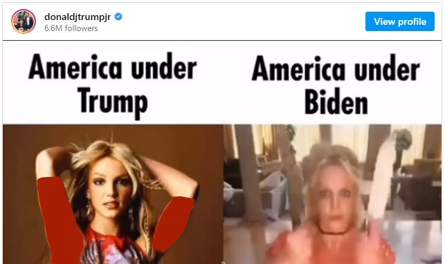 ترامپ جونیور میمهایی از اسپیرز منتشر کرده است که او در هر دو دستش چاقو دارد و با قرار دادن این عکس در کنار عکسهای دهههای ۱۹۹۰ و اوایل دهه ۲۰۰۰ به رسانههای آمریکایی تاخت و همچنین دوران ریاست جمهوری پدرش را با ریاست جمهوری جو بایدن مقایسه کرد.
