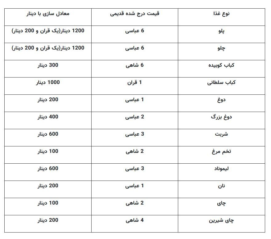 به گزارش سایت طلا، قیمتهایی که از خوراکها در رستوران آقاخان تبریز ثبت شده است نشان میدهد در حالی که در این دوره زمانی قیمت برنج ۶ عباسی، برابر با یک قران و دویست دینار بود، قیمت کباب ۶ شاهی یا به عبارتی ۳۰۰ دینار بوده است.