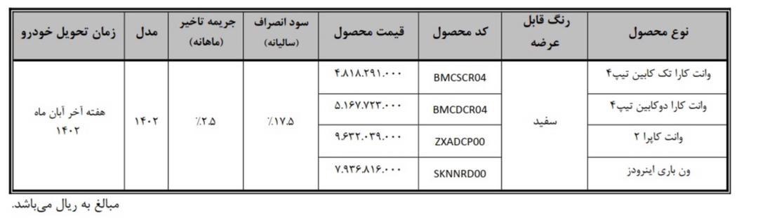 شرایط طرح فروش فوری بهمن موتور مهر 1402 شامل وانت کارا تک کابین، دو کابین ، کاپرا و رسپکت اعلام شد.