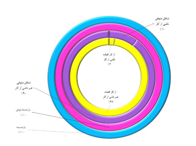 در این میان دو درصد ازکارافتادگیها ناشی از کار و ۹۸ درصد آنها غیر ناشی از کار بوده است. در حالت شاغل متوفی نیز ۱۰ درصد فوت شاغلین ناشی از کار و ۹۰ درصد فوتها غیر ناشی از کار بوده است.
