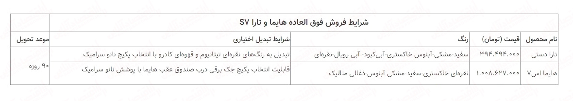 بر اساس اطلاعیه جدید ثبت نام ایران خودرو، تارا دستی و هایما S۷ طبق قیمت کارخانه ایران خودرو به ترتیب حوالی ۳۹۴ و یک میلیارد تومان به فروش گذاشته شده است. همانطور که گفتهشد متقاضیان ثبت نام فروش فوق العاده ایران خودرو ۹۰ روز خودروی خریداری شده را تحویل خواهند گرفت.