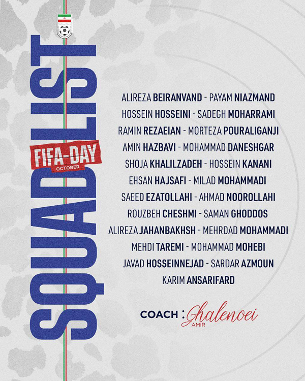 همچنین وحید امیری، میلاد سرلک، یاسین سلمانی و امید نورافکن نیز بدلیل مصدومیت در این فهرست حضور ندارند تا فرایند درمان خود را تکمیل کنند.