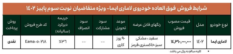 در این شرایط فروش مشتریان می توانند از ساعت 12 صبح روز دوشنبه 17 مهرماه لغایت پایان روز دوشنبه 24 مهرماه نسبت به خرید خودرو اقدام کنند. جریمه دیرکرد در تحویل لاماری ایما ۳۶ درصد به صورت سالانه اعلام شده است.