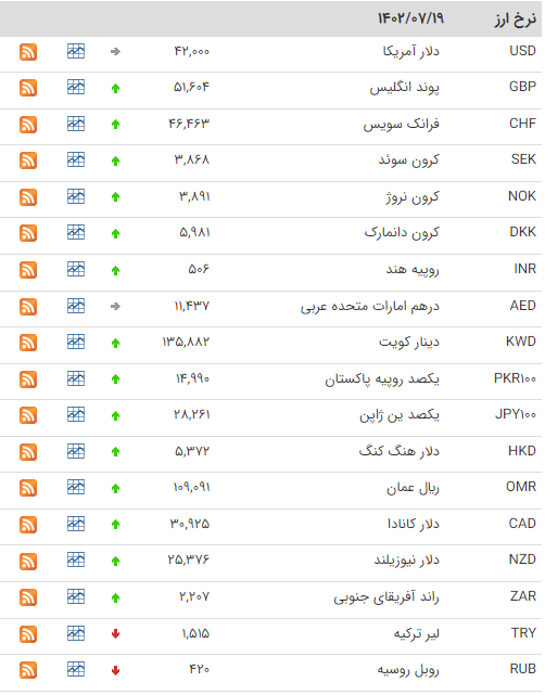بانک مرکزی امروز نرخ هر دلار را ۴۲ هزار ریال، پوند را ۵۱ هزار و ۶۰۴ ریال و یورو را ۴۴ هزار و ۵۹۵ ریال اعلام کرد.