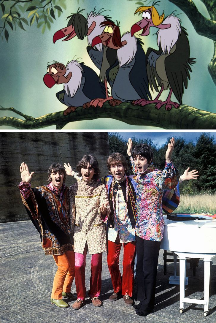 در زمان ساخت نسخه ی انیمیشنی داستان «کتاب جنگل»، دیزنی و فیلمسازانش به فکر حضور افتخاری اعضای گروه موسیقی مشهور بیتلز در این انیمیشن افتادند. سال ۱۹۶۷ بود و آن ها دیگر به یکی از محبوب ترین گروه های موسیقی آن زمان تبدیل شده بودند.