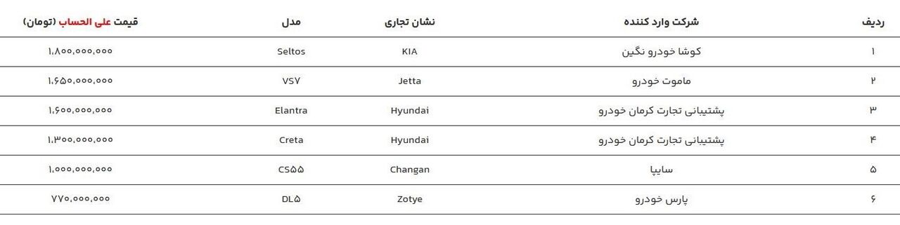 سامانه یکپارچه فروش خودروهای وارداتی قیمت ۶ خودروی وارداتی جدید را به صورت علی الحساب اعلام کرد.