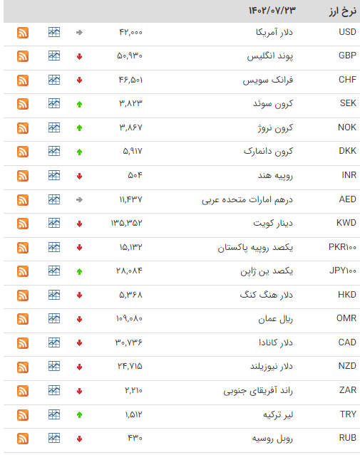 بانک مرکزی امروز نرخ هر دلار را ۴۲ هزار ریال، پوند را ۵۰ هزار و ۹۳۰ ریال و یورو را ۴۴ هزار و ۱۶۴ ریال اعلام کرد.
