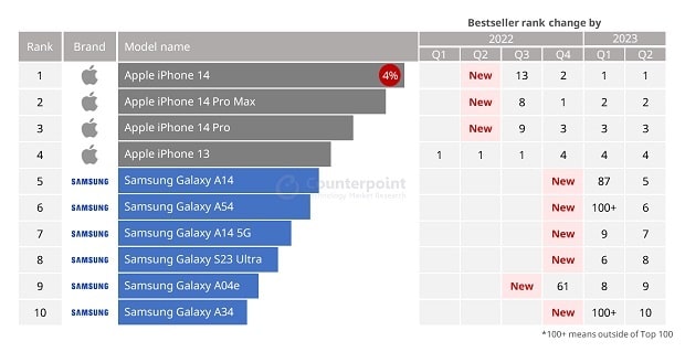 در سه ماه دوم سال ۲۰۲۳ اپل و سامسونگ دوشادوش یکدیگر موفق شدند بخش اعظمی از فروش بازار را به نام خود ثبت کنند و علیرغم کاهش ارزش کلی بازار گوشی های موبایل نسبت به سال گذشته، عملکردی قابل اتکا ارائه کنند.