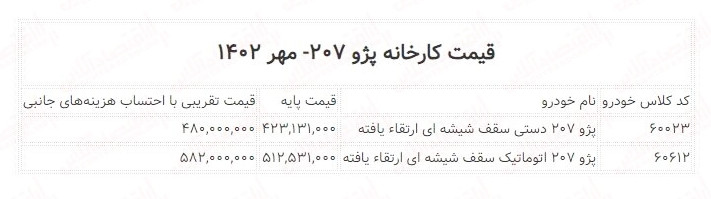 بر این اساس قیمت کارخانه پژو ۲۰۷ سقف شیشه ای دستی ۴۸۰ و قیمت کارخانه ۲۰۷ اتوماتیک سقف شیشه ای نیز ۵۸۲ میلیون شده است. هنوز جزییاتی درباره آپشنهای جدید ارائه نشده است.