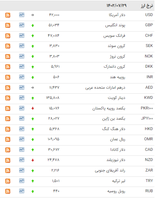 بانک مرکزی امروز نرخ هر دلار را 42 هزار ریال، پوند را 51 هزار و 34 ریال و یورو را 44 هزار و 481 ریال اعلام کرد.