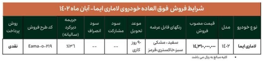 طرح فروش فوری خودرو لاماری ایما از ساعت 11 صبح فردا 1 آبان ماه 1402 به مدت 6 روز فعال خواهد بود.