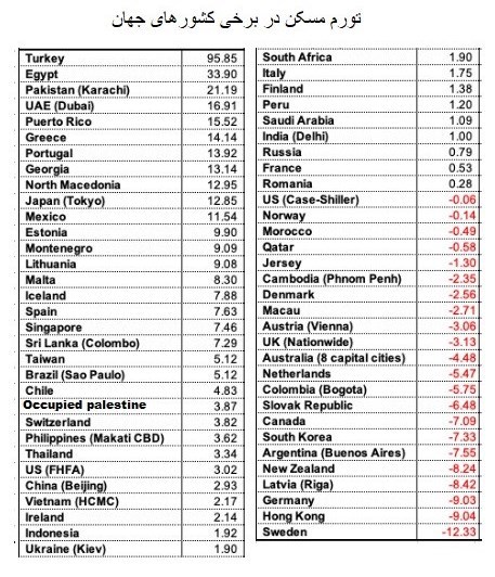 بر اساس این گزارش قیمت مسکن در آمریکا در یک سال گذشته 3 درصد، یونان 14.1 درصد، ژاپن 12.8 درصد، اسپانیا 7.6 درصد، سوئیس 3.8 درصد، چین 2.9 درصد، عربستان 1 درصد و فرانسه 0.53 درصد افزایش یافته است.
