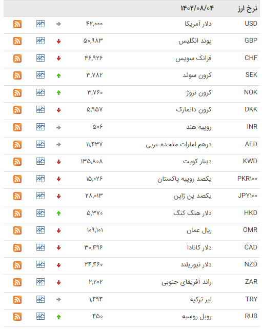 بانک مرکزی امروز نرخ هر دلار را ۴۲ هزار ریال، پوند را ۵۰ هزار و ۹۸۳ ریال و یورو را ۴۴ هزار و ۴۵۴ ریال اعلام کرد.