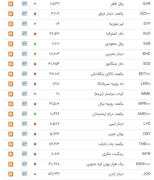 بر این اساس نرخ رسمی روبل روسيه و ريال سعودی افزایش و نرخ پوند انگليس، یورو، یکصد ين ژاپن، دلار کانادا، لير ترکيه، يکصد دينار عراق، دلار استراليا و یوان چين کاهش یافت.